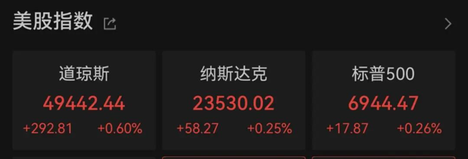 道指涨292.81点,涨幅为0.60%,报49442.44点;纳指涨58.27点,涨幅为0.25%,报23530.02点;标普500指数涨17.87点,涨幅为0.26%,报6944.47点。