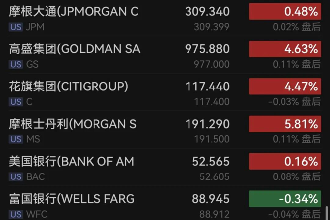 银行股多数上涨,摩根大通涨0.48%,高盛涨超4%,花旗涨逾4%,摩根士丹利涨近6%,美国银行涨0.16%,富国银行跌0.34%。