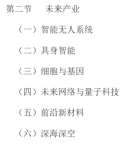 前瞻布局6个未来产业,在具身智能、智能无人系统、前沿新材料等产业打造一批首试首用示范应用场景,以场景驱动前沿技术及产品加快熟化应用,力争在5至10年内产业规模实现倍数级增长。围绕细胞与基因、未来网络与量子科技、深海深空等产业,打造一批高能级创新平台,加快创新成果转化和产业化,推动科技创新与产业创新的深度融合。