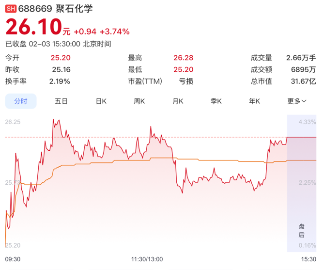 截至2月3日收盘,聚石化学报26.1元,总市值为31.67亿元。