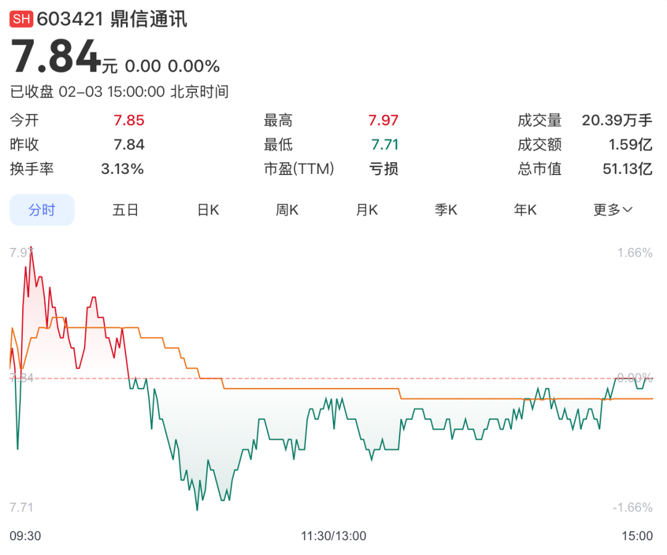 截至2月3日收盘,鼎信通讯报7.84元,总市值为51.13亿元。