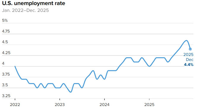 数据显示,去年12月非农就业人数经季节性调整后增加5万人,低于经下修后的11月5.6万人,也不及预期的7.3万人。与此同时,失业率降至4.4%,而市场原本预计为4.5%。