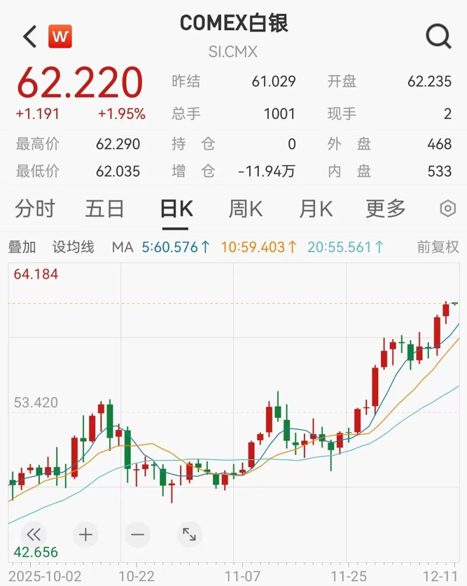 12月11日,美联储宣布降息后,纽约期银再创历史新高,突破62美元/盎司,年内涨幅已经超过116%。