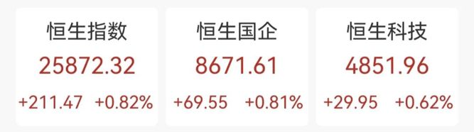 4月14日,港股震荡攀升,恒生指数收涨0.82%,报25872.32点;恒生科技指数上涨0.62%,报4851.96点;恒生中国企业指数上涨0.81%,报8671.61点。全日大市成交额为2367.76亿港元,较前一交易日的2079.09亿港元有所上升。南向资金净卖出20.17亿港元。