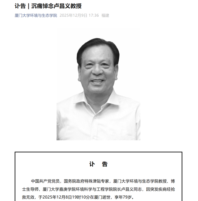 据厦门大学环境与生态学院官微12月9日消息,厦门大学环境与生态学院教授、博士生导师,厦门大学嘉庚学院环境科学与工程学院院长卢昌义同志,因突发疾病经抢救无效,于2025年12月8日19时10分在厦门逝世,享年79岁。