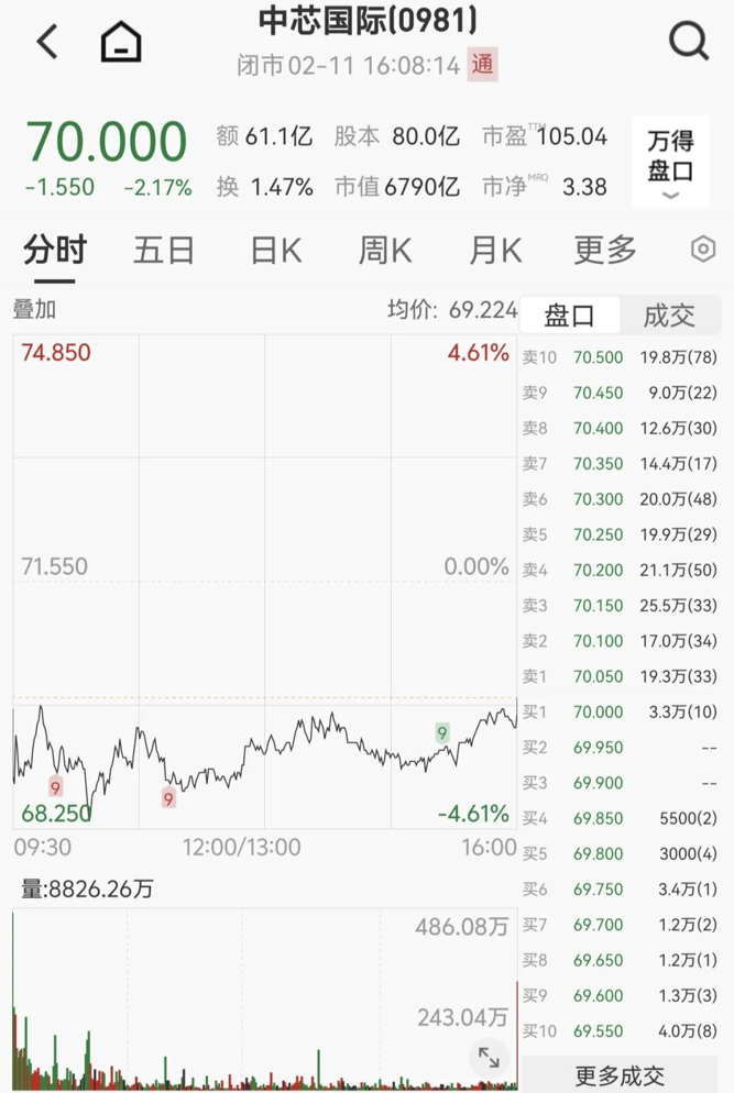 尽管之前交易日中芯国际披露净利润同比大增60.7%,公司股价却一度大跌4.61%,全天收于70港元/股,跌幅为2.17%。
