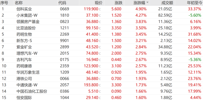 恒生指数成份股中有62只上涨,23只下跌。其中,创科实业涨4.90%,小米集团涨4.27%,领展房产基金涨3.83%,领涨蓝筹。