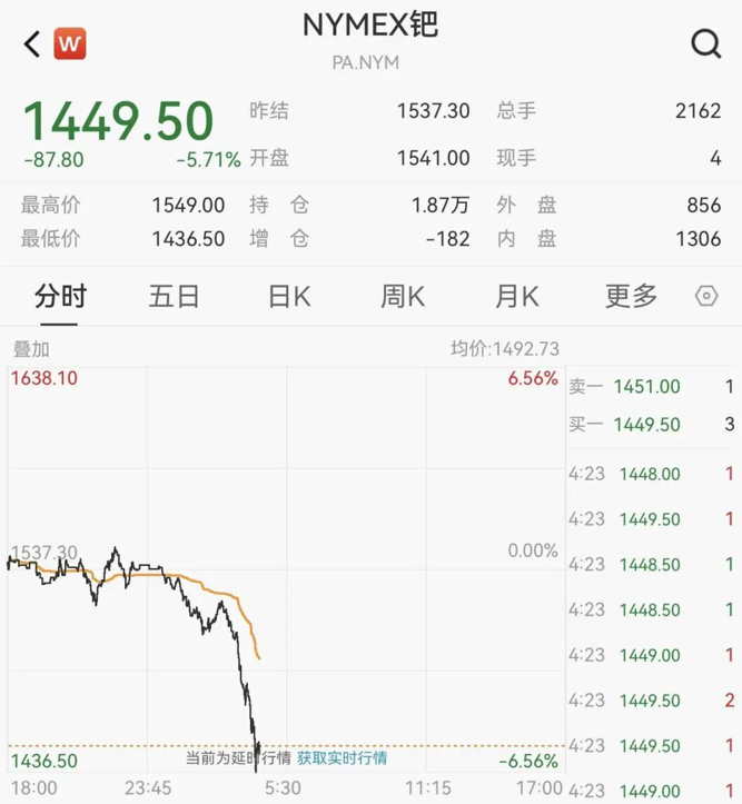 此外,NYMEX钯金期货主力大跌5.71%,最新报1449.5美元/盎司。