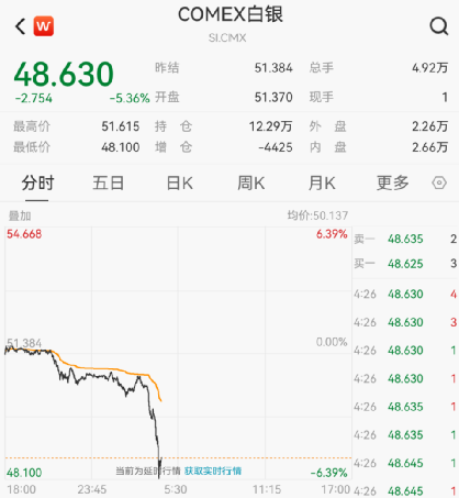 COMEX白银期货失守49美元/盎司,日内跌5.36%。