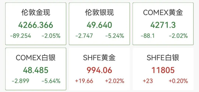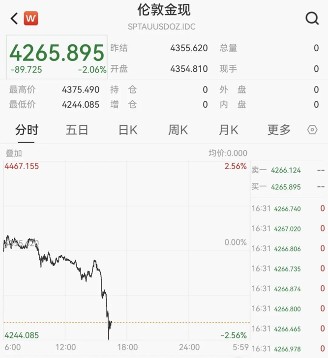 现货黄金一度失守4250美元/盎司,截至发稿时跌2.06%;COMEX黄金期货价格短线下挫,现跌2.02%。