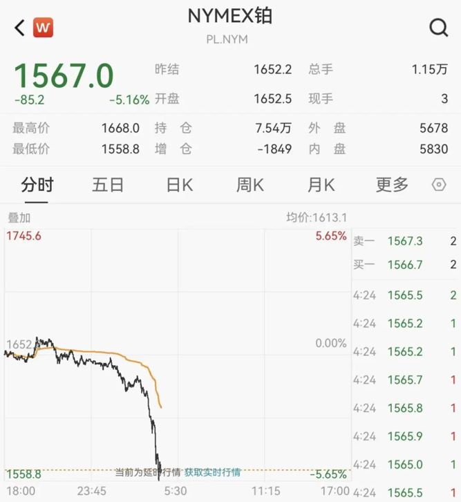 NYMEX铂金期货主力大跌5.16%,最新报1567美元/盎司。