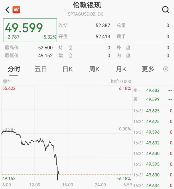 现货白银跌破50美元/盎司,为10月10日以来首次,日内跌幅达5.32%。