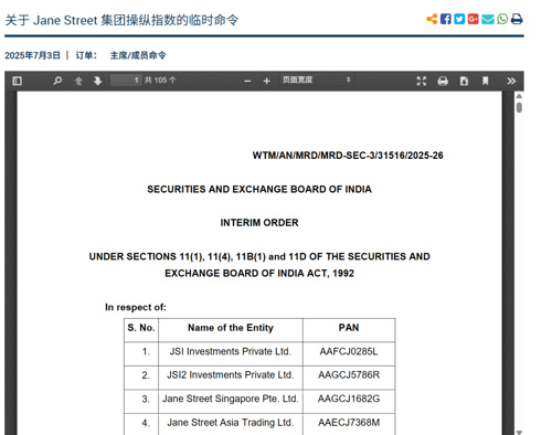 在对外国交易公司采取的史上最严厉行动中,印度证券交易委员会(SEBI)在7月3日发布的临时命令中表示,Jane Street及其相关实体(JS集团)将不再被允许参与印度国内证券市场。