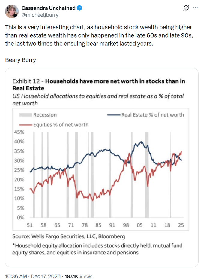 伯里在社交平台X上分享了一张“非常有趣”的图表,其中显示,美国家庭持有股票财富大幅攀升,最近超过了房地产财富。伯里称,这是只在上世纪60年代末和90年代末才出现的现象,而前两次发生这种情况时,“随后的熊市持续了数年”。