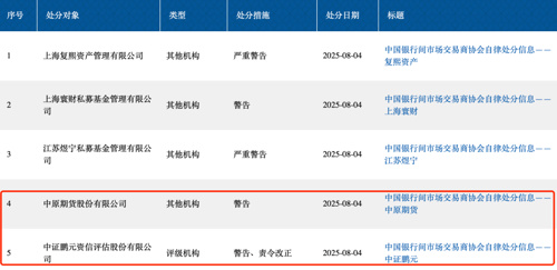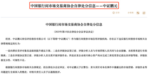 8月8日晚间,中国银行间市场交易商协会发布了多条自律处分信息,其中,中证鹏元资信评估股份有限公司(以下简称中证鹏元)因向潜在受评对象发送级别提升建议方案等多项违规,被警告、责令改正;还有中原证券子公司中原期货,因未审慎核查、客观上协助某发行人“自融”发行,被警告。