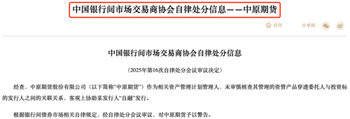 另一条自律处分信息显示,经查,中原期货作为相关资产管理计划管理人,未审慎核查其管理的资管产品穿透委托人与投资标的发行人之间的关联关系,客观上协助某发行人“自融”发行。经自律处分会议审议,对中原期货予以警告。