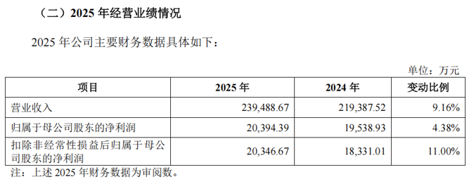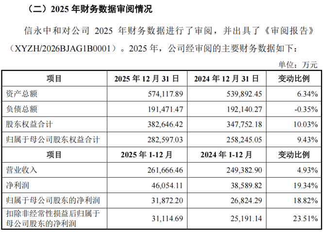 招股意向书显示,宏明电子经审计机构审阅的2025年全年营业收入为26.17亿元,同比增长4.93%;归母净利润为3.19亿元,同比增长18.82%。
