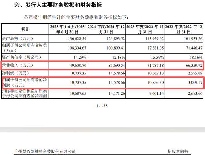 2022年至2024年及2025年上半年,慧谷新材的营业收入分别为6.64亿元、7.17亿元、8.17亿元及4.96亿元,归母净利润分别为3009.17万元、1.09亿元、1.46亿元及1.07亿元。