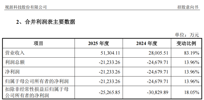 招股意向书显示,受益于核心产品硅基OLED微型显示屏的销售收入提升,同时战略产品开发业务获得下游客户认可,视涯科技经审计机构审阅的2025年全年营业收入为5.13亿元,同比增长83.19%;归母净利润为-2.12亿元,亏损同比收窄13.96%。