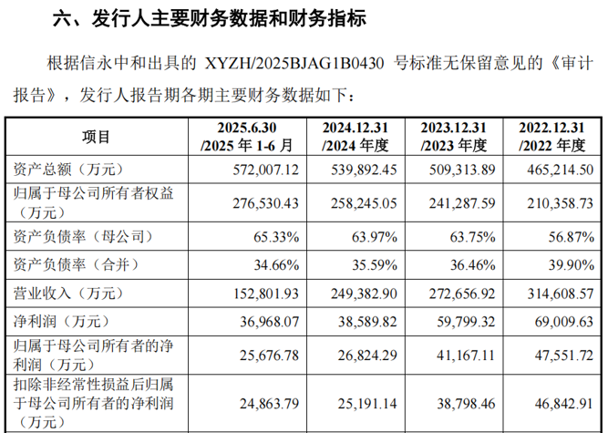 2022年至2024年及2025年上半年,盛龙股份的营业收入分别为19.11亿元、19.57亿元、28.64亿元及22.89亿元,归母净利润分别为3.44亿元、6.19亿元、7.57亿元及6.04亿元。