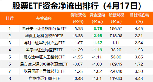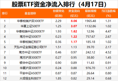 4月17日,A股三大指数集体收涨,小盘股盘中反复活跃,金融股大幅拉升。当天股票ETF市场整体呈现净流入态势,沪深300净流入最多,上证50关注度也比较高,半导体类、人工智能类ETF则有一定净流出。