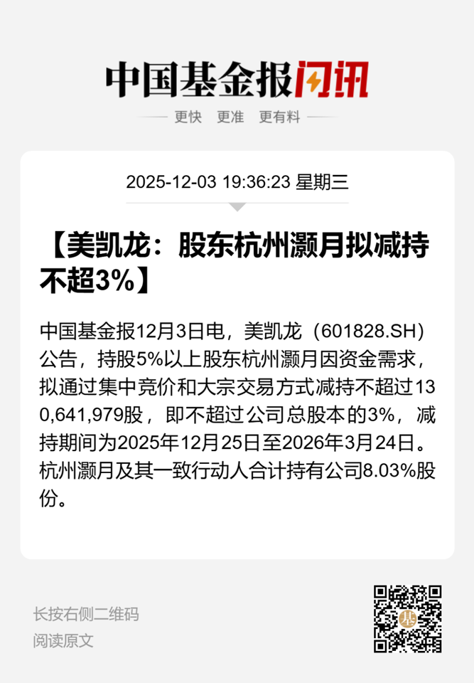 12月3日晚间,美凯龙发布公告称,杭州灏月企业管理有限公司(以下简称杭州灏月)以资金需求为由,拟减持公司不超过3%的股份,包括以集中竞价方式减持不超过1%的股份、以大宗交易方式减持不超过2%的股份。