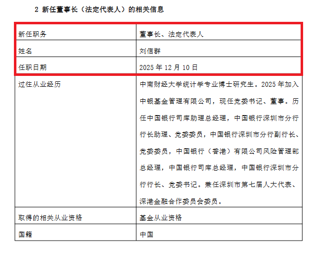 12月11日,中银基金管理发布关于董事长(法定代表人)变更的公告,刘信群担任公司董事长。