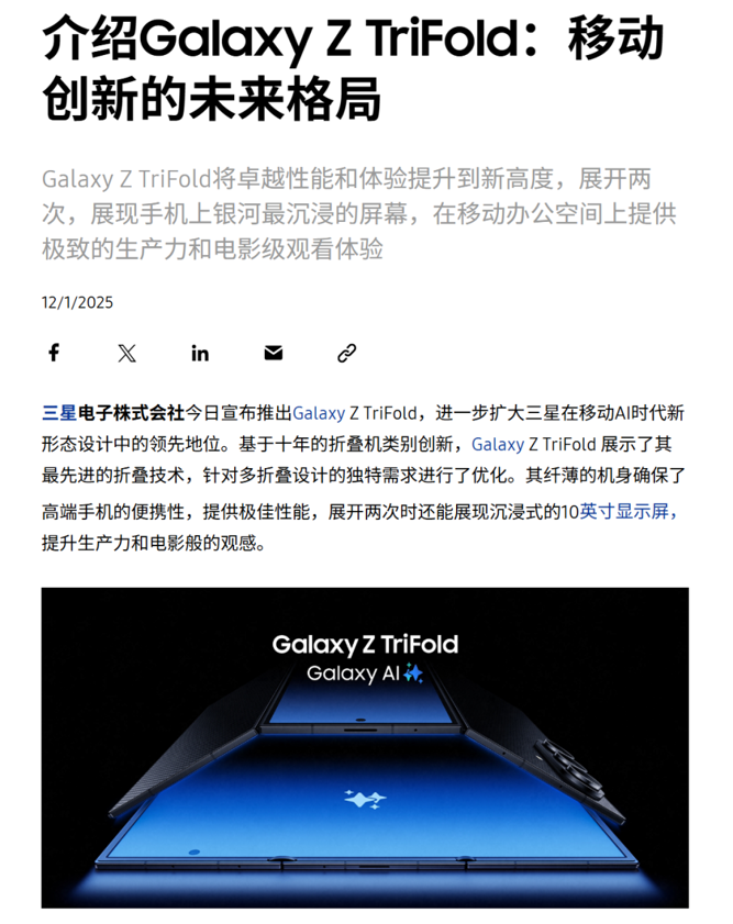 12月2日,三星宣布推出Galaxy Z TriFold折叠手机。三星称,Galaxy Z TriFold展示了其最先进的折叠技术,其纤薄的机身确保了高端手机的便携性,展开两次时还能展现沉浸式的10英寸显示屏,提升生产力和电影般的观感。