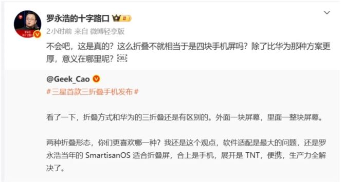 不过,Galaxy Z TriFold的折叠形态也遭到了知名博主罗永浩的“辣评”。他在转发“三星首款三折叠手机发布”的微博时点评称,“这么折叠不就相当于是四块手机屏吗?除了比华为那种方案更厚,意义在哪里呢?”