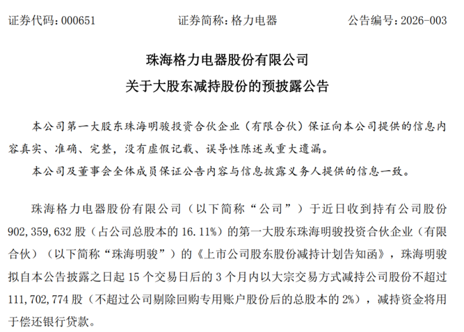 公告显示,珠海明骏目前持有格力电器股份902,359,632股,占公司总股本的16.11%,为公司第一大股东。该部分股份来源于2020年1月23日从珠海格力集团有限公司以协议转让方式受让,且已于此前履行完毕36个月的锁定期承诺,本次减持不存在违反股份锁定承诺的情形。