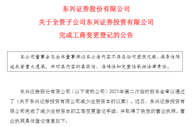 2月6日,东兴证券发布公告称,公司全资子公司东兴证券投资有限公司(以下简称东兴投资)已完成减少注册资本的工商变更登记手续,并取得了换发的营业执照。