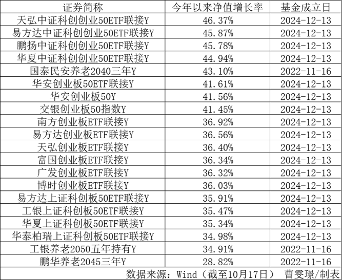 今年以来,个人养老金基金业绩显著反弹。Wind数据显示,截至10月17日,仅一只产品年内收益告负,平均单位净值涨幅达到15.13%。其中,天弘中证科创创业50ETF联接Y单位净值涨幅达46.37%,暂列第一;紧随其后的是易方达中证科创创业50ETF联接Y、鹏扬中证科创创业50ETF联接Y,净值涨幅均超45%;此外,华夏中证科创创业50ETF联接Y、国泰民安养老2040三年Y、华安创业板50ETF联接Y、华安创业板50Y、交银创业板50指数Y的净值涨幅均超40%。