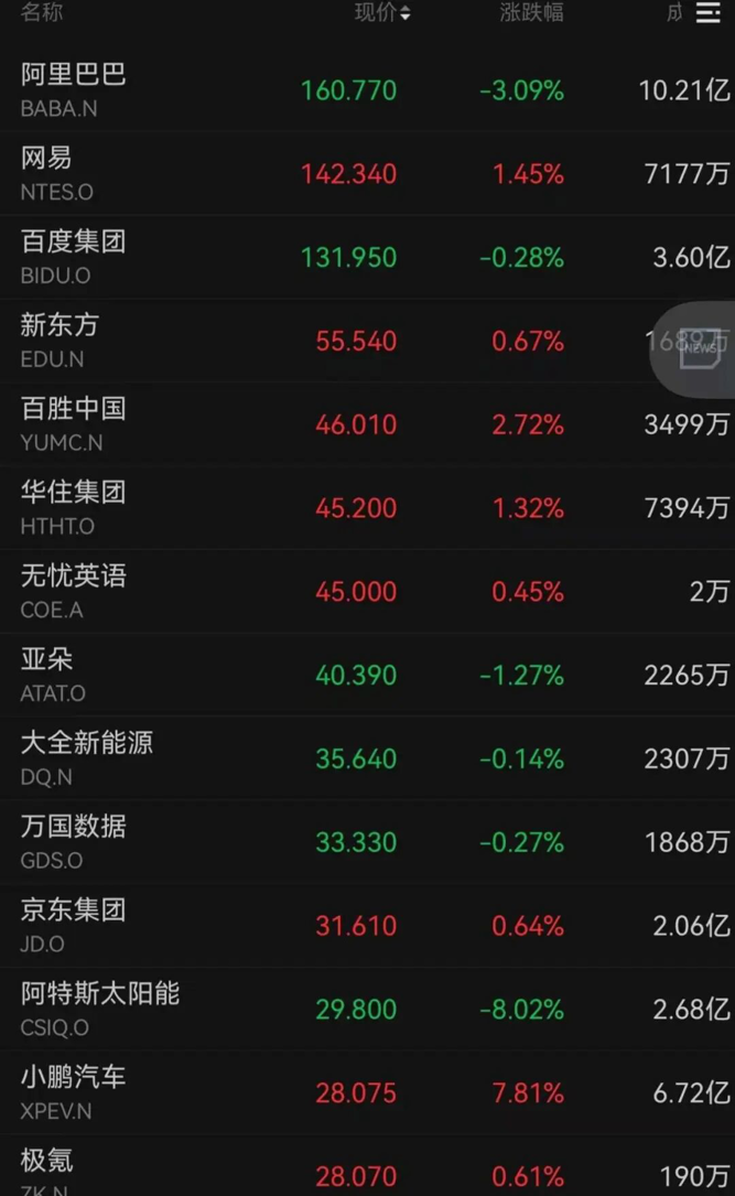 小鹏汽车大涨7.81%,百胜中国上涨2.72%,网易上涨1.45%,华住集团上涨1.32%。