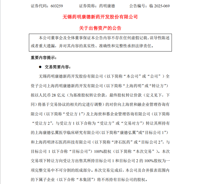 药明康德公告称,转让方向受让方出售所持康德弘翼100%股权、津石医药100%股权,是一项完整交易中不可分割的组成部分,并且受让方1、受让方2在相关协议下的义务及责任是共同且连带的。