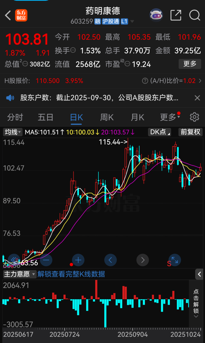 截至10月24日收盘,药明康德A股股价报103.81元/股,涨幅达1.81%,总市值为3082亿元。