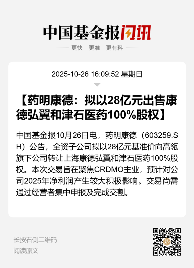 10月26日晚间,药明康德发布公告称,公司全资子公司上海药明康德新药开发有限公司拟以28亿元的基准股权转让价款,向高瓴投资旗下私募股权基金成立的公司转让从事临床研究服务业务的资产,预计对公司2025年度净利润产生较大的积极影响。