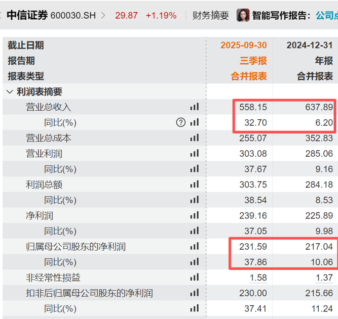业绩方面,2025年前三季度,中信证券实现营业收入558.15亿元,同比增长32.70%;实现归母净利润231.59亿元,同比增长37.86%;ROE(净资产收益率)达8.15%,同比增加1.85个百分点。对比来看,中信证券2025年前三季度的归母净利润已超2024年全年水平(217.04亿元)。