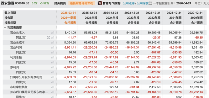 业绩方面,西安旅游2026年一季度实现营业总收入8401.09万元,同比下降11.47%;归属于母公司所有者的净亏损为2663.59万元,上年同期净亏损3231.9万元。
