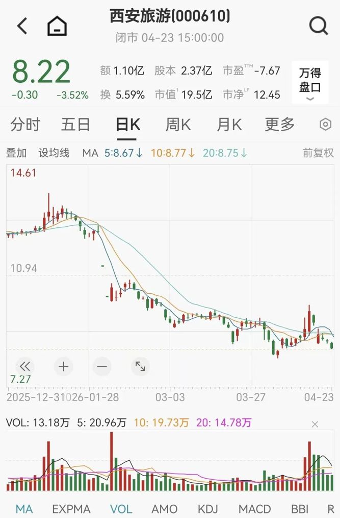 截至4月23日收盘,西安旅游股价报8.22元/股,总市值为19亿元。