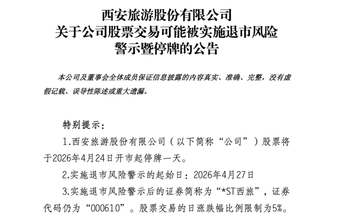 经申请,西安旅游股票将于4月24日开市起停牌一天,自4月27日复牌后实施退市风险警示,证券简称变更为“*ST西旅”,日涨跌幅限制为5%。