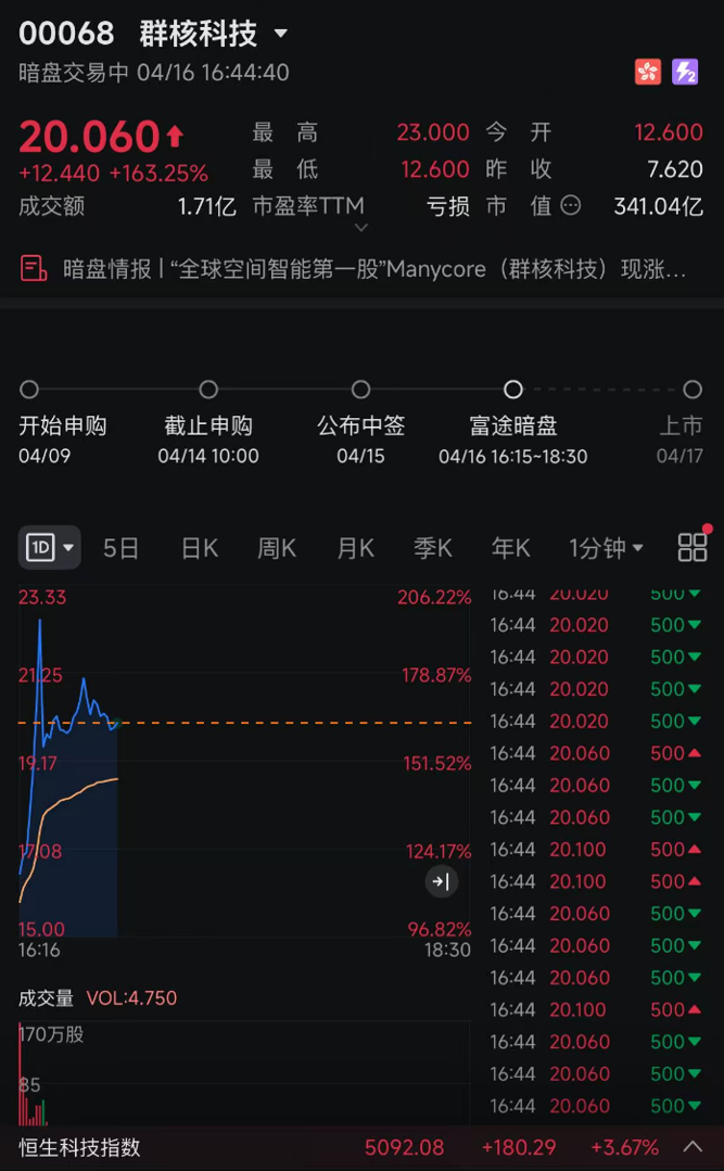 4月16日,“杭州六小龙”第一股——群核科技港股暗盘一度涨超195%,最高报23港元/股,总市值超340亿港元。