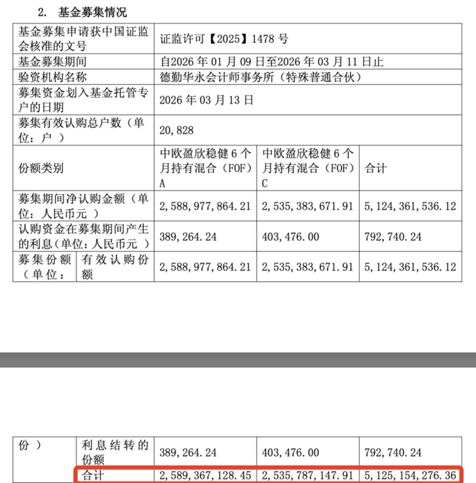 3月14日,中欧盈欣稳健6个月持有期混合FOF发布成立公告,募集有效认购总户数超过2万户,募集金额达到51.25亿元。