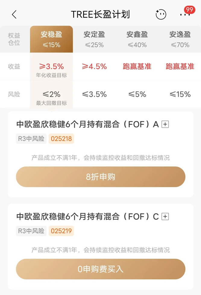 招商银行App的“长盈计划”页面中显示,中欧盈欣稳健6个月持有期混合FOF归为“安稳盈”系列,股票等风险类资产上限为15%,对应的目标年化收益率为≥3.5%,目标最大回撤为≤2%。