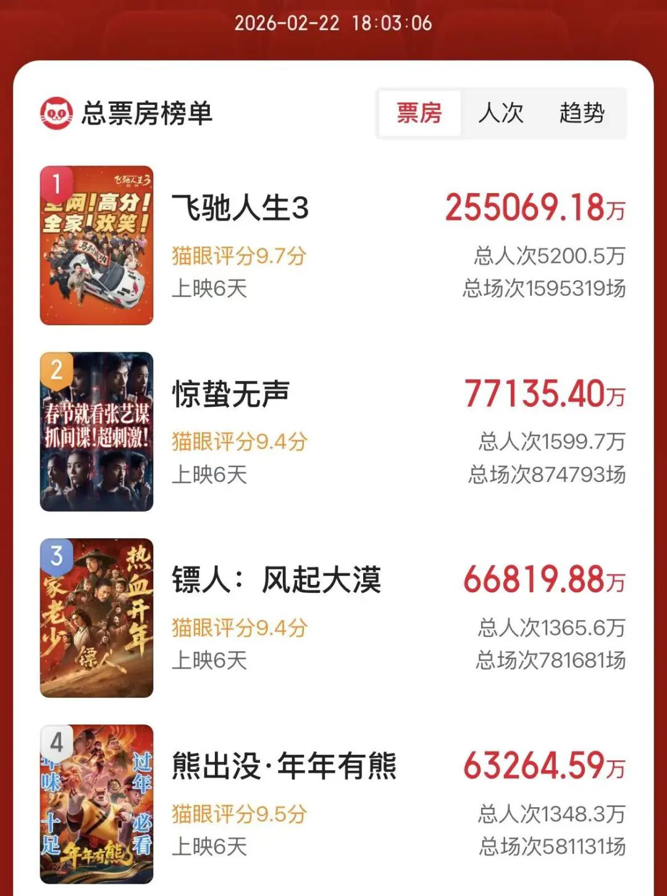 吴京、谢霆锋、李连杰等动作演员齐聚的《镖人:风起大漠》反超《熊出没·年年有熊》,升至第三,票房已达到6.7亿元,成为影史春节档武侠片票房冠军。
