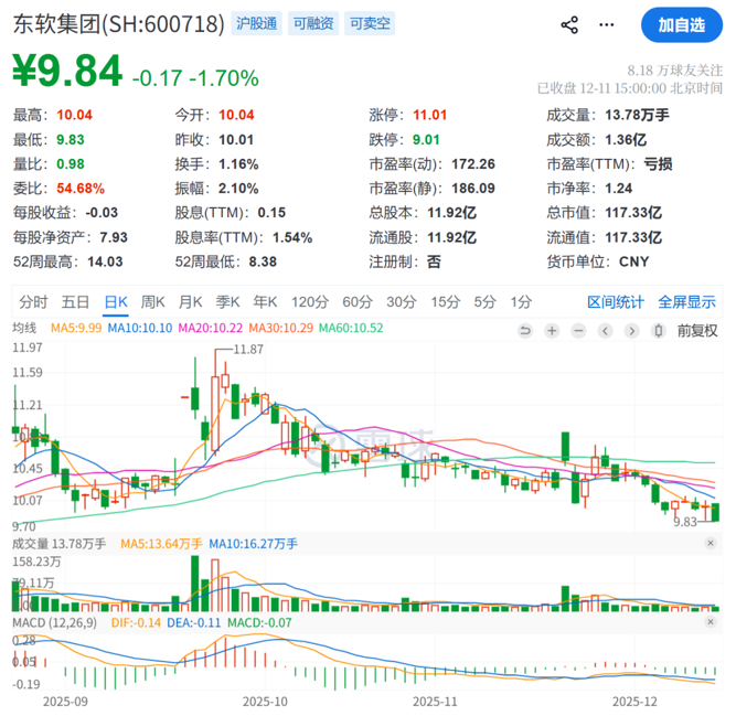 截至12月11日收盘,东软集团股价为9.84元/股,总市值为117亿元。