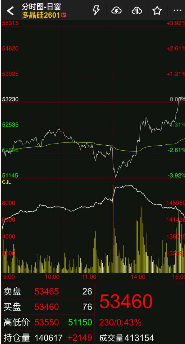 受最新辟谣消息影响,多晶硅期货主力合约强势反弹,日内由跌转涨,此前一度跌近4%。