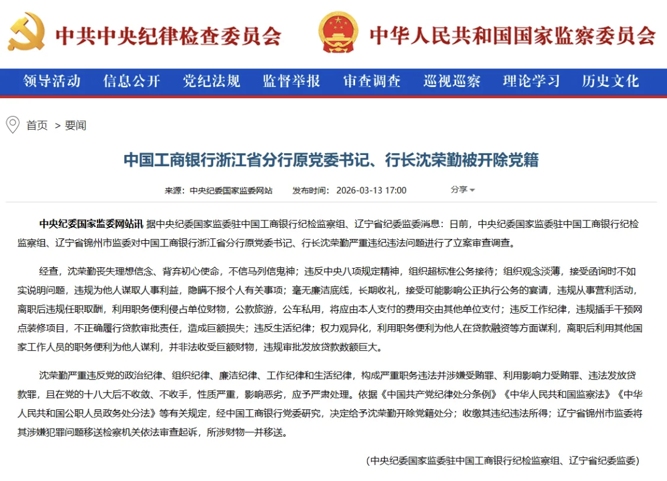 3月13日,中央纪委国家监委官网通报:中国工商银行浙江省分行原党委书记、行长沈荣勤被开除党籍。