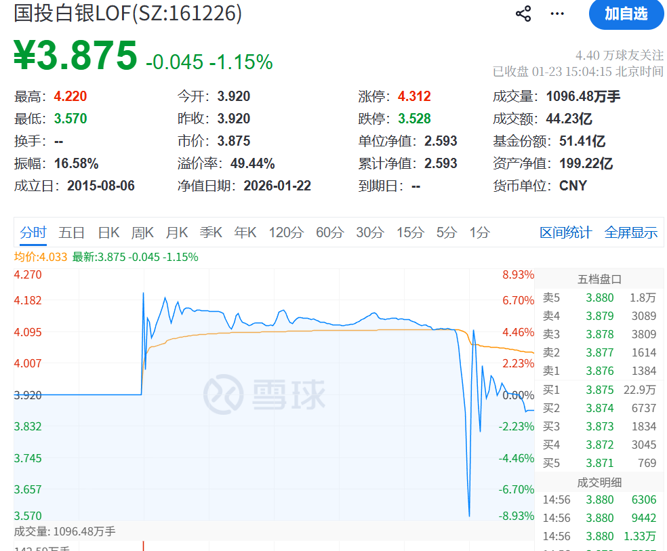 此外,最近的市场热门投资品种,国投白银LOF临近尾盘一度闪崩,从涨超7%转为跌超7%,收盘的时候小幅下跌。去年第四季度以来,白银价格快速上涨。作为我国公募基金市场唯一一只主要投资于白银期货的产品,国投白银LOF场内价格近期也大幅飙升,自2025年12月初以来,国投白银LOF已提示二级市场溢价风险超30次,盘中临时停牌超20次。