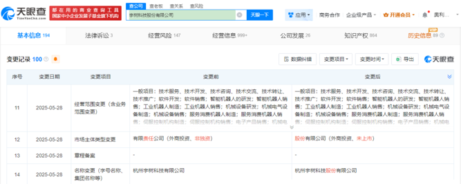 宇树科技的动作更快。天眼查显示,5月28日,宇树科技的关联公司杭州宇树科技有限公司,更名为杭州宇树科技股份有限公司,市场主体类型从有限责任公司(外商投资、非独资)变为股份有限公司(外商投资、未上市)。