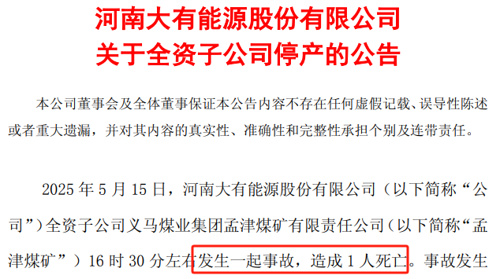根据公告,2025年5月15日,大有能源全资子公司义马煤业集团孟津煤矿有限责任公司(以下简称孟津煤矿)16时30分左右发生一起事故,造成1人死亡。